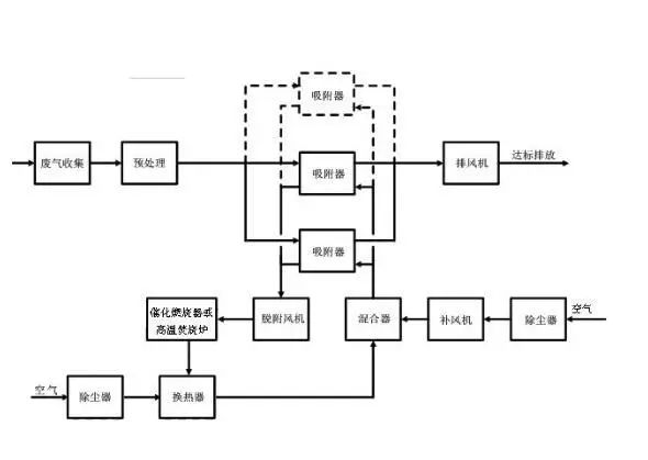 三、 當(dāng)廢氣中的有機(jī)物不宜回收時(shí),宜 采用熱氣流再生工藝。脫附產(chǎn)生的高濃度有機(jī)氣體采用催化燃燒或高溫焚燒工藝進(jìn)行銷毀。